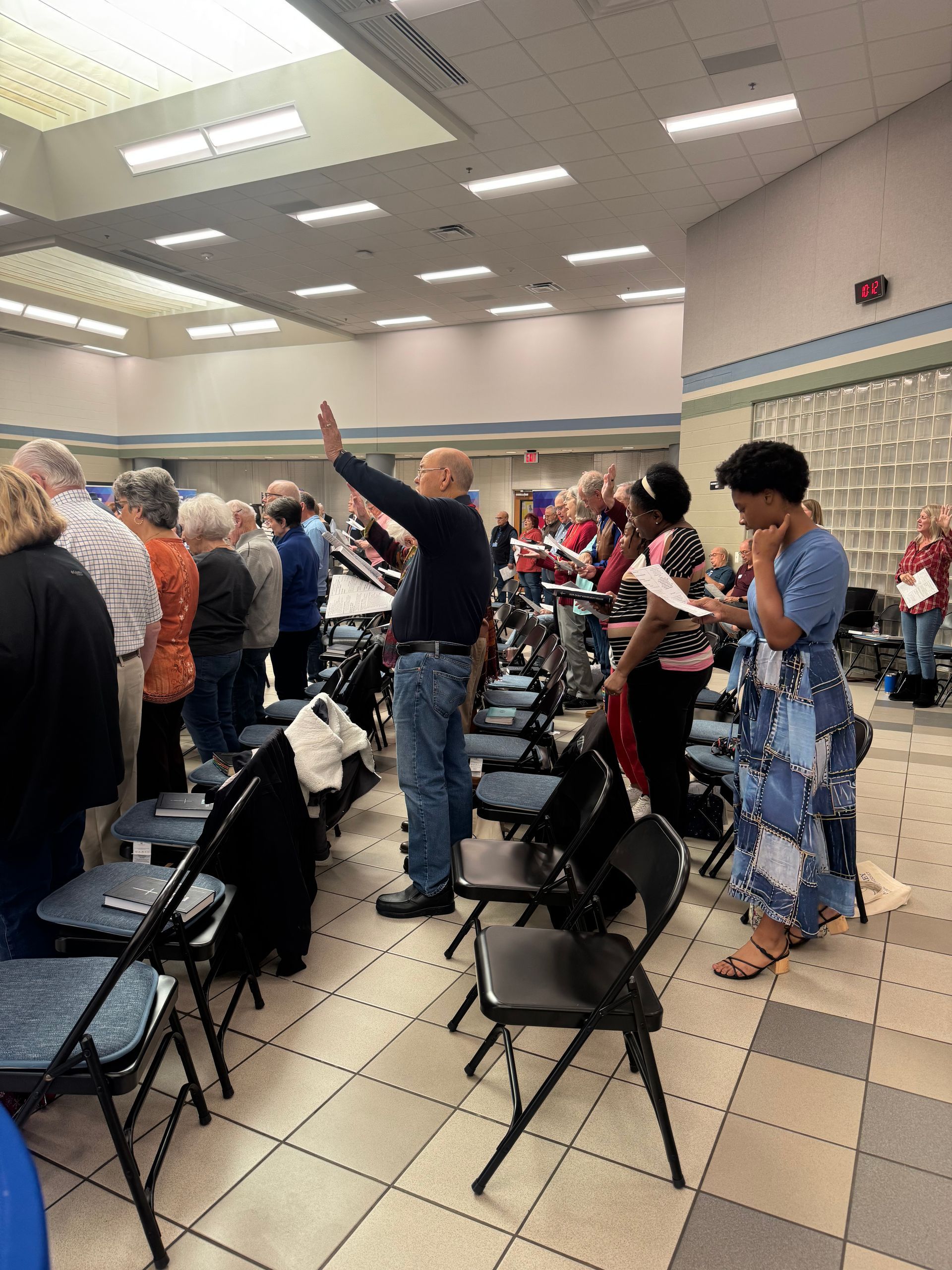We worship through music by singing a mix of hymns and contemporary worship songs.